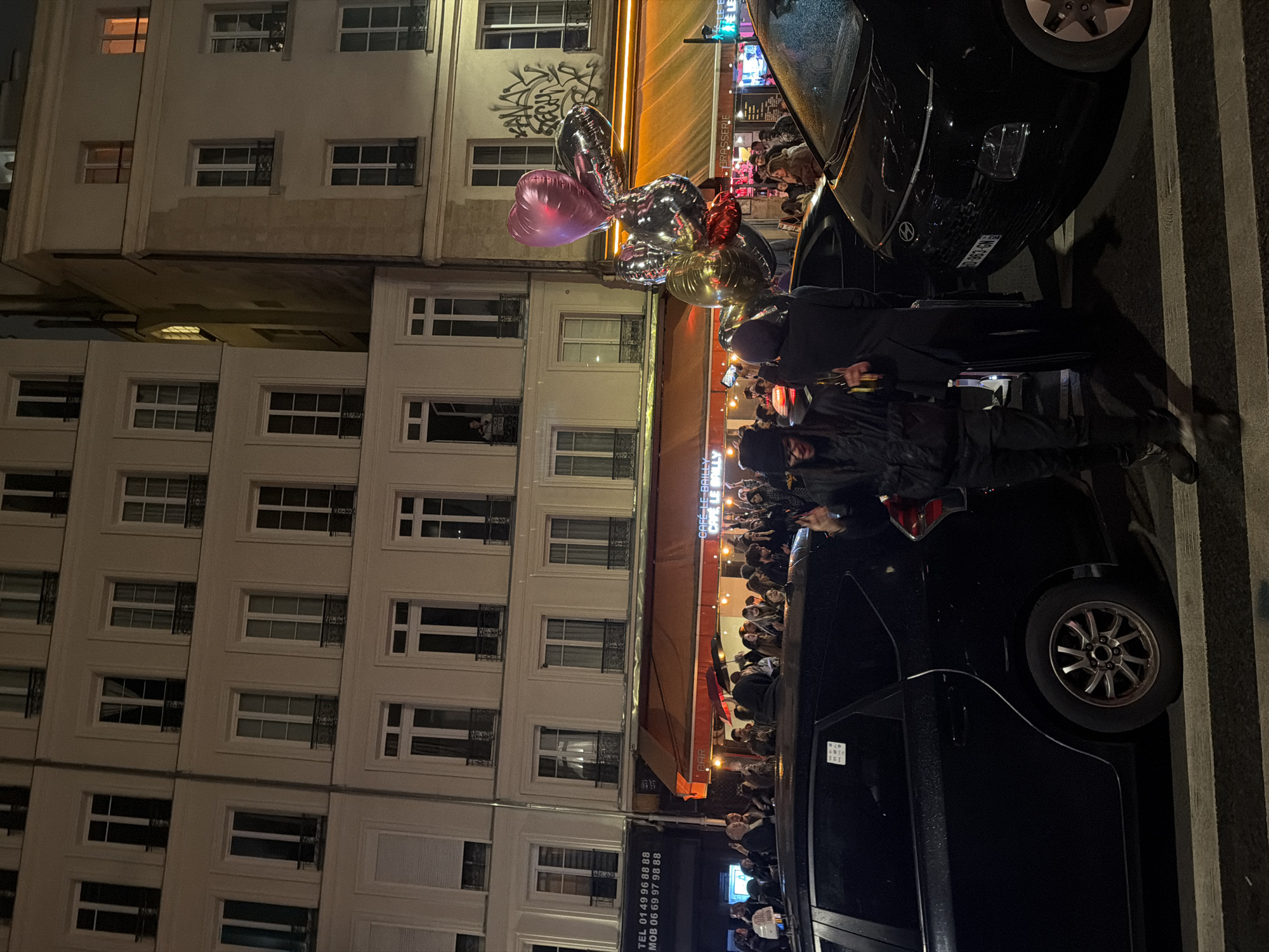 The image depicts a nighttime urban street scene in Paris, France, specifically at or near Café Le Bailly, likely on Boulevard des Italiens in the 9th arrondissement, given the architectural style and business name. In the foreground, two individuals are positioned on a marked pedestrian crossing between two dark-colored vehicles. The person on the left, facing right, wears a dark puffer jacket, dark pants, and a dark beanie, with dark hair visible. They hold a bottle with a yellow label in their right hand. The second individual, seen from behind on the right, wears a dark coat and dark pants, and is holding a cluster of metallic balloons, including one large pink heart-shaped balloon, several silver metallic balloons, and one red metallic balloon. To the left, a dark hatchback or small SUV is partially visible, showing its rear left side and a five-spoke metallic wheel. To the right, the front right side of a dark Hyundai minivan or large SUV is visible, displaying a French license plate (partial: HD-963-GN). In the mid-ground, behind the vehicles, a large crowd of people is gathered outside a brightly lit establishment identified by an orange awning and signs reading "CAFÉ LE BAILLY" and "BRASSÉRIE." Many individuals are standing, appearing to socialize. The background consists of multi-story Parisian buildings with numerous windows, some featuring small wrought iron balconies. The building on the left shows a phone number sign with French prefixes (01, 06). On the upper right building facade, dark graffiti is visible above the café. A single person is observed looking out from an open window on an upper floor of the left building. The overall scene is illuminated by artificial street and building lights.
