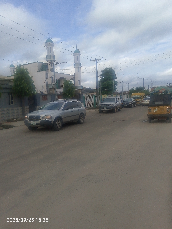 This image displays an urban street scene in Lagos, Nigeria, under a partially cloudy sky. The timestamp 2025/09/25 16:36 appears in the bottom left corner. A prominent mosque, characterized by white walls, a curved balcony, and three distinct minarets topped with green domes and finials, is situated on the left side of the street in the background. The asphalt road, showing signs of wear, occupies the foreground and midground. A silver Volvo XC90 SUV is positioned in the left foreground. Further down the road, a line of vehicles includes a dark Toyota 4Runner SUV, followed by additional cars and a yellow commercial bus. On the far right, a yellow motorized tricycle (Keke Napep) is visible from the rear, carrying a tall, multicoloured tarp-covered load. Numerous utility poles with overhead power lines crisscross the sky and line the street. Sparse green trees are visible along the roadside and adjacent to the mosque. No individuals are clearly discernible, and no specific actions or interactions are depicted.