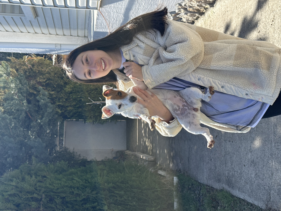 The image depicts a young adult female standing outdoors in Galabovtsi, Bulgaria, on a clear, sunny day. She has long, dark hair and is smiling, facing directly towards the camera. She wears a light blue shirt under a beige or cream-colored fleece jacket with button closures. In her arms, she cradles a small, short-haired dog, predominantly white with brown/tan markings on its head and ears. The dog is also facing the camera, with visible skin patterns or discoloration on its belly. To the left of the subjects, a concrete pathway extends into the background, flanked by tall, dense green conifer trees. A light-colored gate or door is partially visible at the end of this pathway. To the right, a section of a building is visible, featuring light-colored horizontal siding above a rough stone foundation. A metallic, multi-pronged fixture is attached near the building's wall. Strong sunlight casts distinct shadows across the scene.