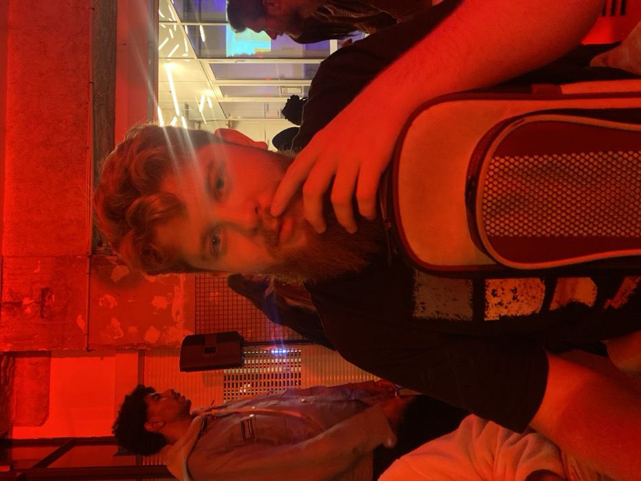 The image depicts an indoor scene heavily illuminated by intense red light. In the foreground, a male with reddish-brown curly hair and a full beard looks directly at the camera, his right hand with fingers extended touching his upper lip. He wears a dark t-shirt with a multi-colored rectangular graphic. A light-colored, padded case with a dark trim and a mesh speaker-like grille rests in front of him. To the left, a second male figure with dark curly hair, wearing a light-colored jacket, stands facing right, partially obscured. Behind him is a dark speaker on a stand and a metal grid wall. To the right, in the background, a brightly lit modern interior with white walls, ceilings, and glass partitions is visible. A third male figure with a beard is seen in profile on the far right, facing left. The environment is an industrial-style social or event space, specifically identified as Gare Saint Sauveur, Lille, France.
