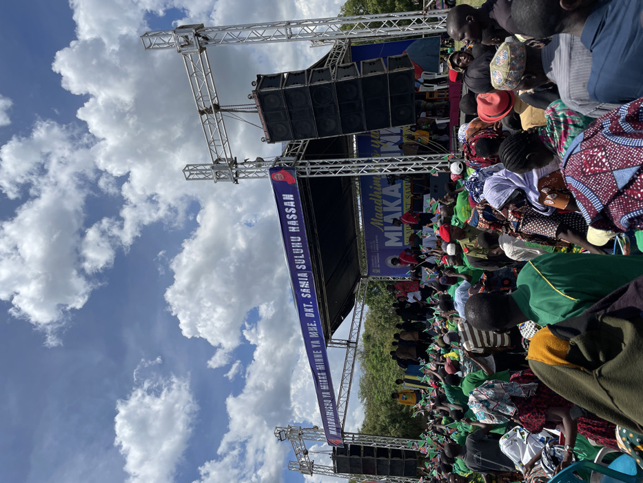 large crowd gathered in front of a stage in Bariadi, Tanzania (latitude: -2