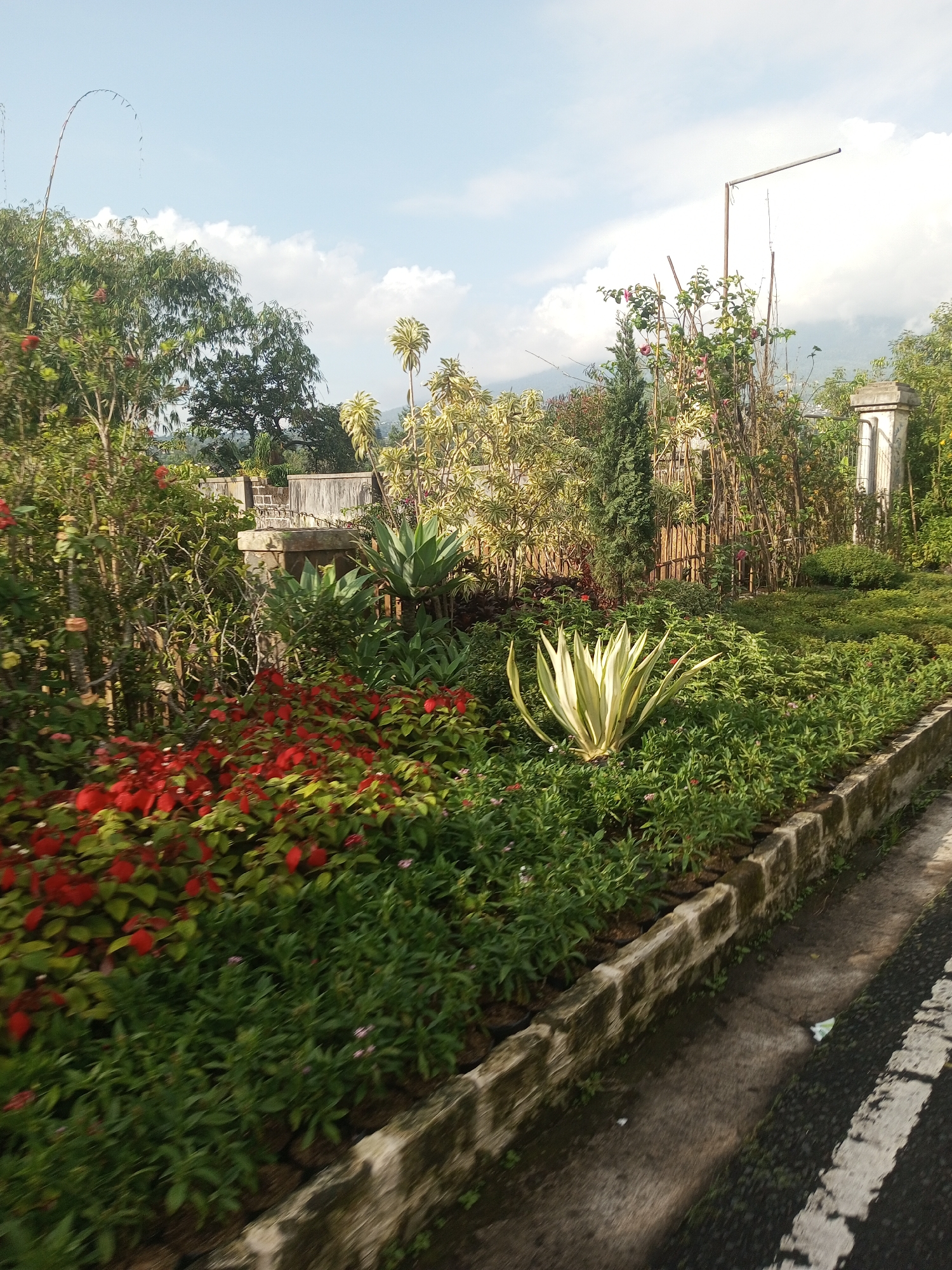 well-maintained flowerbed or garden along a road in Mya Sit Kaing Ywar Thit, Myanmar. The garden is lush, with a variety of plants and flowers. Red flowers are prominent near the front. A large agave plant is also visible. The flowerbed is bordered by a concrete edge. The road has a white line marking. Trees and other vegetation are in the background. The sky is partly cloudy. A light pole is visible behind some plants, and a structure of some type, is barely discernible in the distance through the foliage.