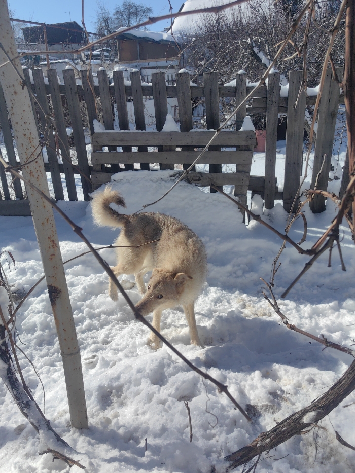 The scene depicts a light-colored, medium-sized dog standing in a snow-covered outdoor area, consistent with a residential backyard or garden in Volgograd, Russia, during daylight hours