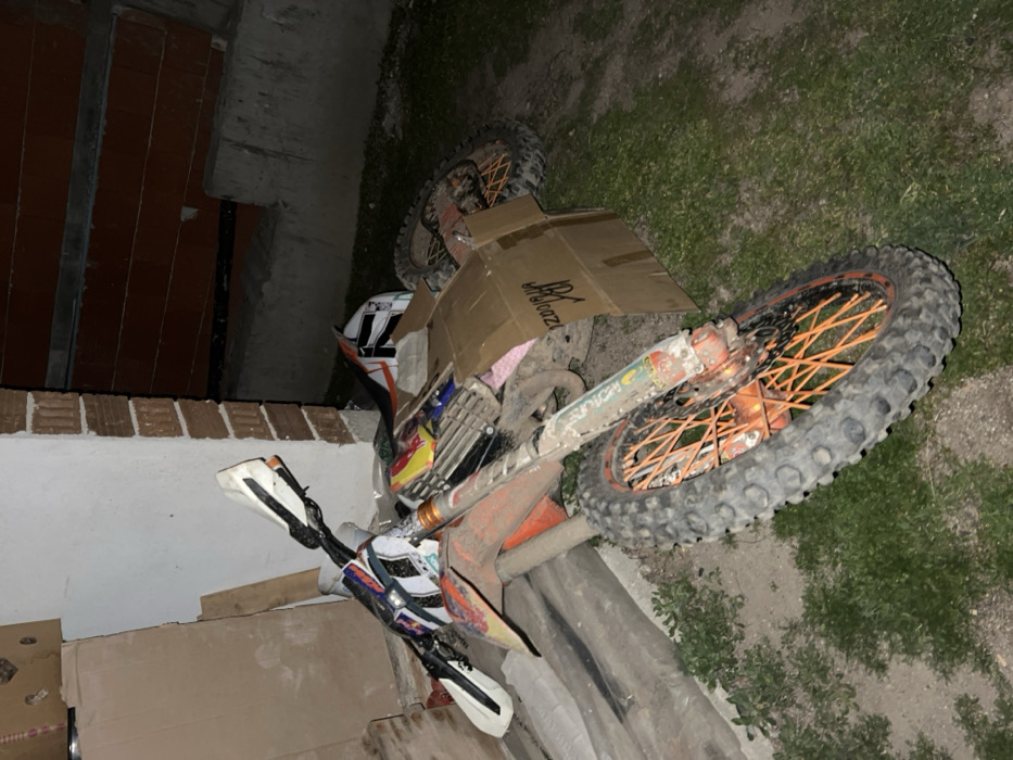 In Draginovo, Bulgaria, an outdoor scene is depicted under low light conditions, likely at night. The primary subject is a partially disassembled or damaged orange and black dirt bike, lying on its left side on patchy grass and dirt. Its front wheel, with knobby tire and prominent orange spokes, is visible in the foreground. Handlebar guards, bearing a white and black color scheme, are detached or angled upwards near the handlebars. Various motorcycle components, including parts with Red Bull branding and white plastic sections, are scattered around the bike. A brown cardboard box, partially open and bearing illegible writing, rests near the center of the frame. In the background, a light-colored wall with visible brickwork on its right edge stands beside a darker, possibly concrete or unfinished brick structure. No individuals are present, and no actions or interactions are observed.