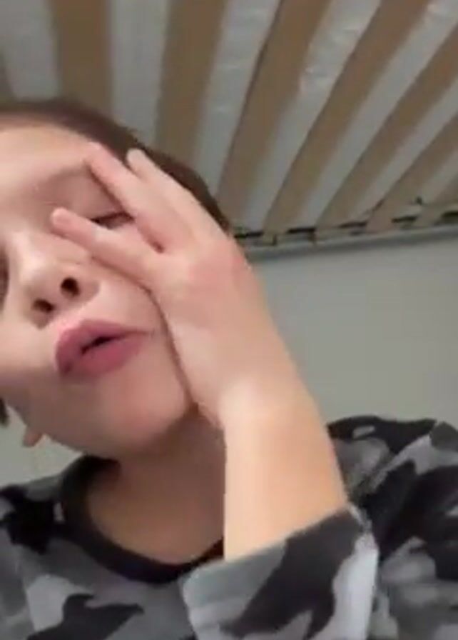 A boy with short brown hair is lying down, looking up at the camera. He is wearing a gray camouflage patterned shirt. He makes a series of faces while holding his hand to his cheek. A bed frame is visible in the background.