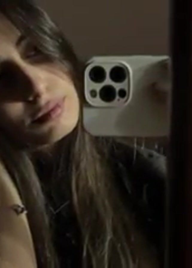 A woman is taking a selfie in a mirror with her phone. She has long brown hair and is wearing a dark jacket. She first looks to the side, then purses her lips into a kissy face. The room is dimly lit. The phone case is white, and the phone has multiple camera lenses.