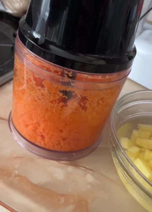 - "countertop with a black food chopper containing finely chopped orange vegetables, likely carrots" by FM-auqI32, licensed under CC BY 4.0