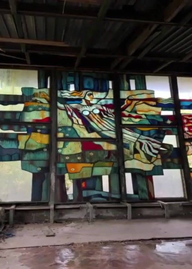 The video pans across a large, stained-glass window in a dilapidated room. The window is composed of irregularly shaped pieces of colored glass in shades of green, blue, red, yellow, and white, forming an abstract design. The room is in disrepair, with a damaged ceiling, a dirty floor, and remnants of seating along the wall. The overall impression is one of neglect and decay.