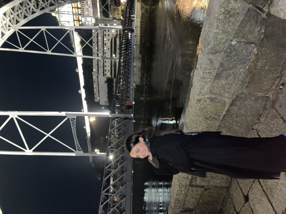 A young woman in a black coat stands beside a stone wall, next to a river at night. The Dom Luís I Bridge looms large in the background, its iron arches illuminated against the dark sky. A row of buildings with lit windows stands opposite the bridge. The river reflects the city lights, creating a shimmering effect on the water's surface.