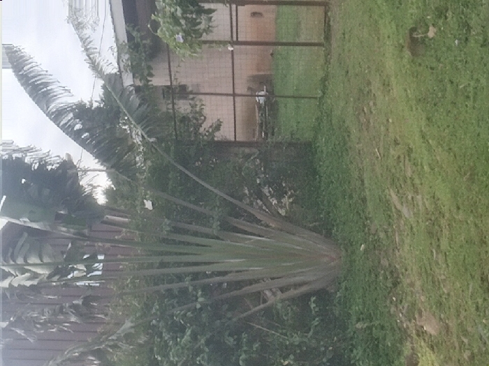 A large, leaning traveler's palm dominates the left side of the image. Its fan of leaves arches towards a building with a metal fence, partially obscured by greenery. Lush green grass covers the ground on the right. The angle of the shot suggests the camera is tilted, causing the palm and building to appear off-kilter. The overall scene is a yard or garden setting.