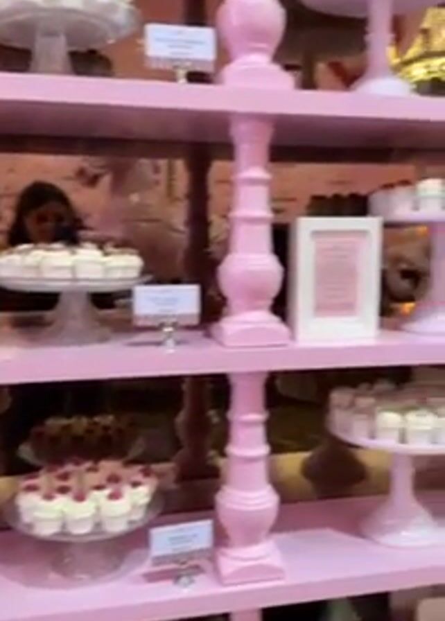 A short video shows a pink shelf display with a variety of cupcakes, cakes, and sweets on display. The shelves are painted pink and decorated with ornate, pink pillars. Each shelf has cupcakes and cakes on tiered stands, and in some cases, glass domes cover individual cupcakes. Small signs are placed in front of each type of treat. Some signs include “Eat, Sleep, Bathe, Repeat”. The background features a reflective surface, possibly a mirror, which vaguely shows people and additional decorative items. The camera moves upward to showcase the full height of the display.