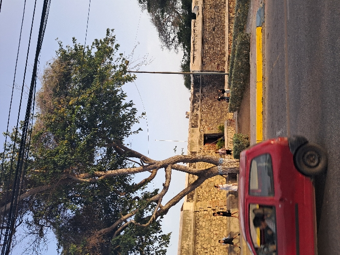 A large tree spreads its branches near a street with a moving red car. Stone walls line the sidewalk, and pedestrians stroll along. The road's edge is marked with yellow paint. Overhead, power lines crisscross the sky, adding a modern element to the historical architecture.
