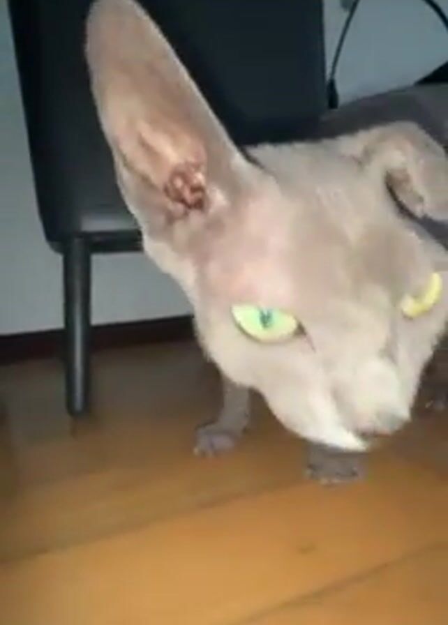 close-up view of a hairless Sphynx cat with light-colored skin and piercing green eyes. The cat is standing on a light brown wooden floor next to a black chair and a black object that appears to be part of a desk. The camera angle is low, looking up at the cat. The cat looks directly at the camera and then looks up slightly.