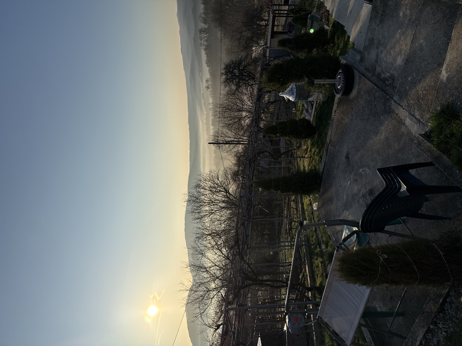 The image displays an outdoor, rural landscape in the city of Balinovtsi, Bulgaria, captured during either sunrise or sunset. The sun, a bright yellow orb with visible lens flare, is positioned in the upper left quadrant of the light blue sky, which transitions to a pale yellow near the horizon. Long shadows are cast from left to right across the scene. In the foreground, a concrete patio area with descending steps on the right occupies the lower portion of the frame. On the left side of this patio, a stack of four dark-colored plastic chairs is visible. To the right, a single black car wheel, complete with a central metal stand, rests on the concrete. The midground features a garden space with sparse green grass. Several conical evergreen shrubs are planted within this area, with two prominent ones in the center. A large, bare trellis structure, indicative of a vineyard, stretches across the central and left midground. Numerous deciduous trees, devoid of foliage, are dispersed throughout the garden and mid-distance. A white, covered object, possibly a container, sits on the grass near the center-right. A metal outdoor frame, possibly part of a swing or drying rack, is visible on the far left. The background consists of multiple layers of rolling hills or mountains, densely covered with trees, some bare and some retaining foliage. A significant band of white to light-gray fog or mist fills the valleys between these distant landforms. No human or animal subjects are present in the scene.