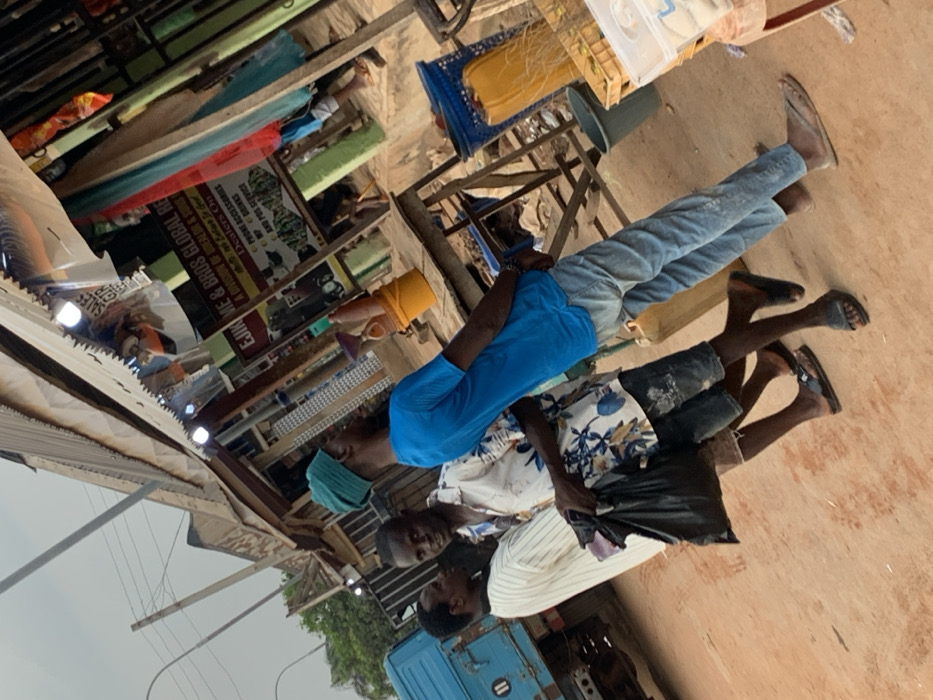 A street scene shows three men and a boy standing outside a storefront. The men are casually dressed, one in a blue shirt and jeans, another in a floral shirt and shorts, and the third in a striped shirt. The boy is wearing a yellow headdress and a blue shirt. They appear to be in a marketplace or a busy street, with various items and structures visible in the background. A sign for "EJIK ME & BROS GLOBAL RE" is also visible on the storefront.
