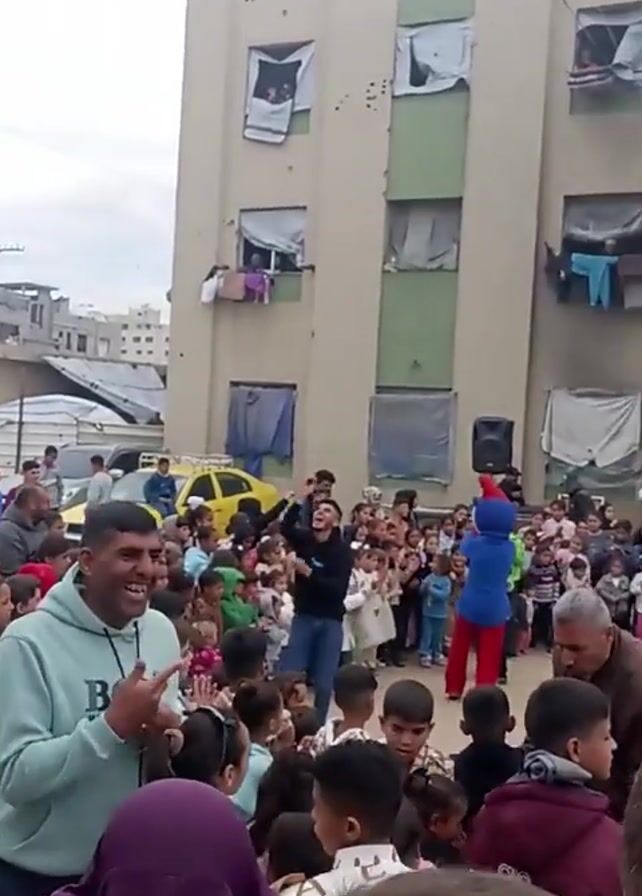 large group of children gathered outside a building that appears to be damaged, possibly by gunfire, indicated by the numerous bullet holes in its facade. Adults are also present, some observing from the crowd and others potentially involved in organizing the event. A person in a blue and red costume, likely for entertainment purposes, interacts with the crowd. There's a speaker set up suggesting music or announcements are being made. The overall environment appears to be impoverished or recovering from conflict, judging by the building's condition and the presence of laundry hanging from windows. The children seem to be enjoying the event despite the setting.