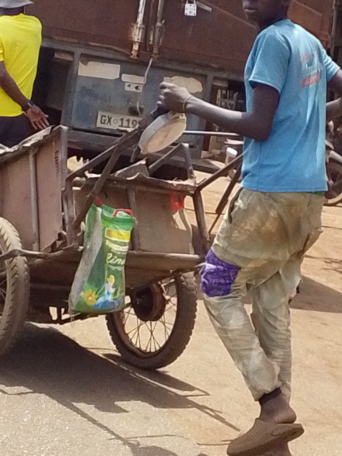 The scene is an outdoor, daytime setting in Sabaa, Ghana. A male individual stands in the mid-ground, oriented towards the left. He wears a light blue short-sleeved t-shirt with a red graphic on the upper back, light-colored long pants with a distinct purple fabric patch on the right knee, and brown slip-on sandals. A light-colored bracelet is visible on his right wrist. He holds a white, oval-shaped object, possibly a lamp or component, in his right hand, which is attached to the metal frame of a rust-colored utility cart. A green plastic bag, featuring "Linden" text and a Cinderella illustration, hangs from the left side of this cart. Partially visible in the upper left, another male individual wearing a bright yellow short-sleeved shirt is seated on a larger, dark-colored utility vehicle in the background. This background vehicle displays a license plate "GX-119" and has a white padlock visible on its upper-right section. The ground consists of light brown, unpaved earth, illuminated by strong sunlight, casting distinct shadows from the cart and individuals.