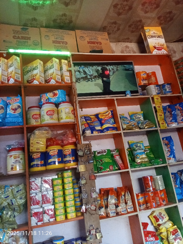 A well-stocked shop shelf contains an assortment of food items, including boxes of cornflakes, oatmeals, powdered milk in bags and cans, Milo, peak milk, and sugar. Boxes labeled "CARIN" are stacked on top. A TV displaying a procession is embedded in the shelves. Padlocks hang on a divider. The date "2025/11/18" is visible at the bottom left.