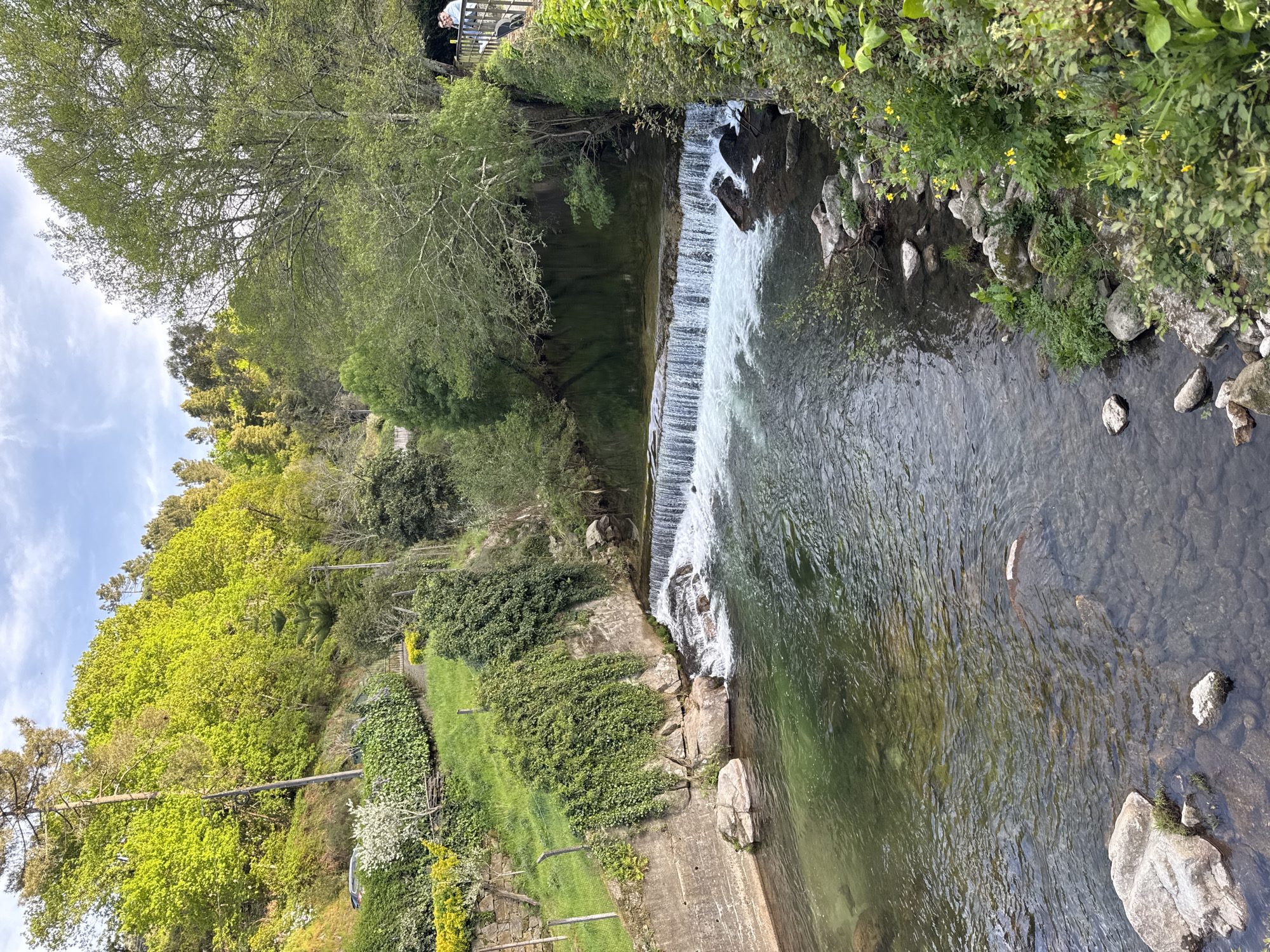The image depicts a river and waterfall landscape in Cinfães, Portugal