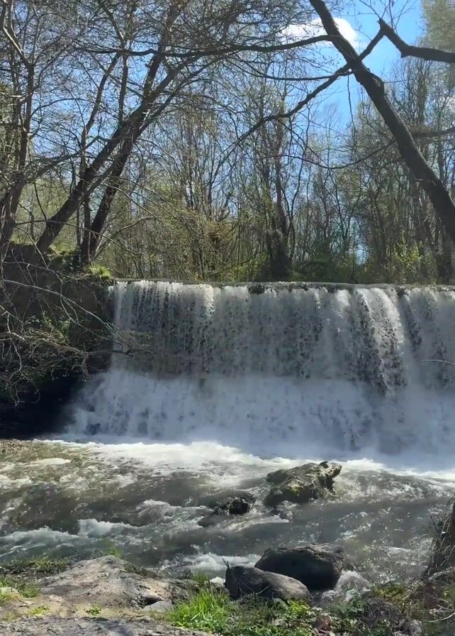 small waterfall in a wooded area. The waterfall spans the width of the frame, with water cascading down into a rocky riverbed. Trees with bare branches surround the waterfall, and the sky is visible through the branches, showing a clear blue sky. The camera is stationary, providing a stable view of the scene. The lighting is bright and sunny.
