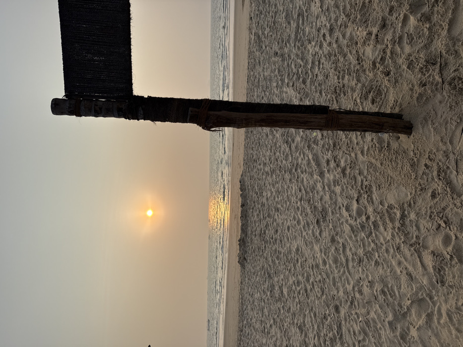 The image depicts a beach scene at sunset in Bhagatwadi, India. The horizon line is visible across the middle of the frame, separating a hazy, light orange sky from the sea. The sun, a bright yellow-orange disc, is low on the horizon, casting a shimmering reflection path on the water. Several small boats are present in the distance on the sea. The foreground features light brown sand with numerous footprints and subtle undulations. In the right foreground, a rustic wooden pole stands vertically, partially wrapped with a darker material, likely rope or fabric. A section of dark, woven material or netting is attached horizontally to the upper part of this pole, extending out of the frame to the right. A small, low sand mound is visible on the beach in the mid-ground. No individuals are present in the scene.
