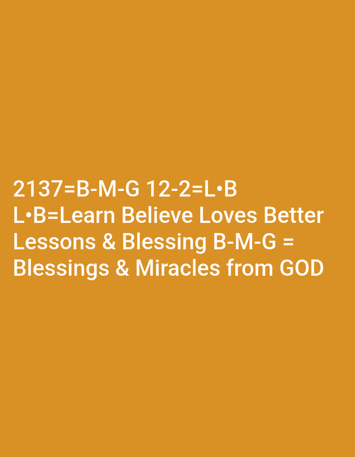The image is a digital representation of a text-based message against a solid yellow background. The text reads, "2137=B-M-G 12-2=L•B L•B=Learn Believe Loves Better Lessons & Blessing B-M-G = Blessings & Miracles from GOD." The coordinates 40.738, -111.885 correspond to Salt Lake City, Utah, USA, although there are no visual clues as to location. The image contains no people or subjects. There are no objects except the textual message. There is no action or interaction depicted. There is no depicted environment, only a solid yellow background.