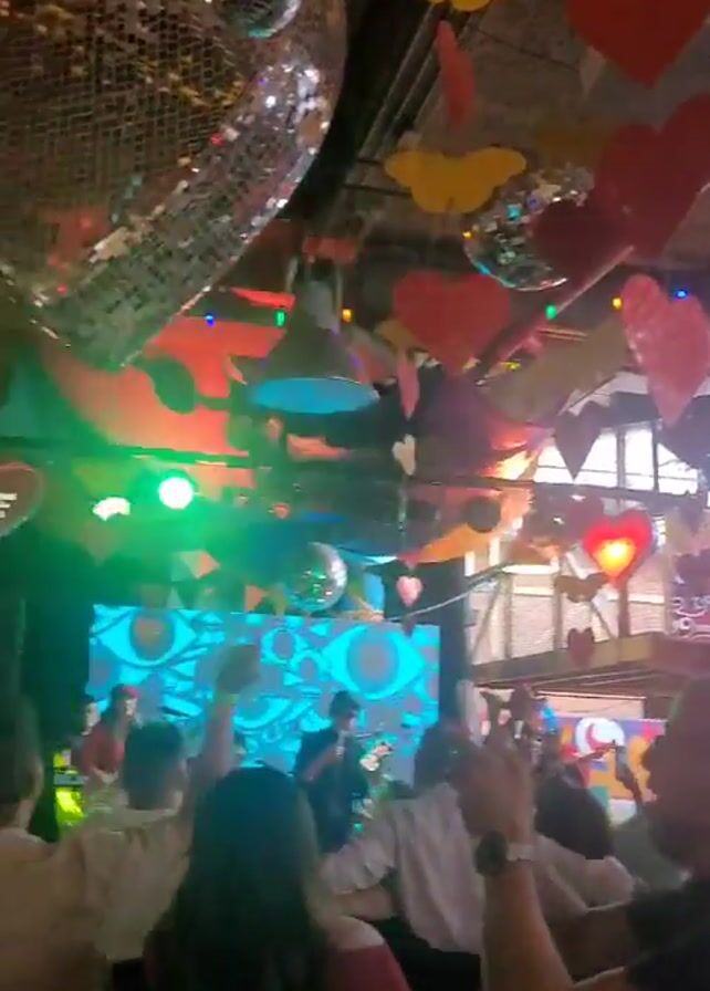 party or club scene with a crowd of people dancing. The room is decorated with disco balls, red hearts, and yellow butterflies hanging from the ceiling. A band is playing on a small stage with a video screen behind them displaying visual effects. People are dressed in casual clothes and are seen dancing and raising their hands in the air. The lighting is colorful, with green, red, and white lights illuminating the scene.