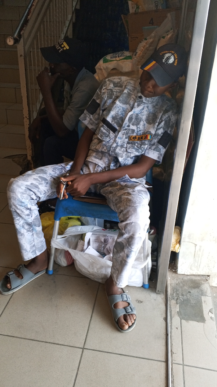 The scene, located in Tarauni, Nigeria, depicts an indoor or semi-enclosed area, likely a storage or passageway, with two individuals present. In the foreground, a person, appearing to be male, is seated on a blue plastic chair with metal legs. This individual wears a light-colored camouflage-patterned uniform consisting of a short-sleeved shirt with black shoulder patches and a "CJTF" patch with a rainbow stripe on the right chest, matching trousers, and grey two-strap sandals. A navy blue baseball cap, emblazoned with "CIVILIAN JOINT TASK FORCE" and a circular emblem, covers the upper part of their face. The person appears to be resting or asleep, with eyes closed and head tilted to the right, leaning against a vertical metallic support structure on the right side of the frame. Both hands are clasped together, holding a small metal object. Underneath the chair, various white and transparent plastic bags containing miscellaneous items, including papers, are visible. To the left and slightly behind the primary subject, a second person is partially visible, seated on a tiled staircase. This individual wears a black baseball cap with a yellow logo, and a light-colored shirt, with one hand near their face. The background is cluttered with stacked cardboard boxes and several white bags, one clearly identifiable as containing "PARBOILED RICE." The floor consists of light-colored tiles, and a tiled staircase with a metal railing is present on the left.