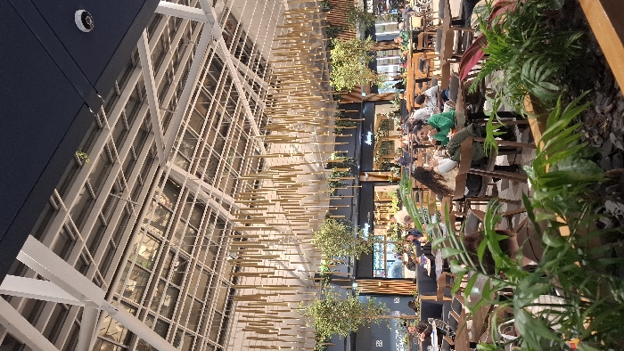 n indoor restaurant scene. Tables and chairs are arranged near lush potted plants. Patrons are seated, seemingly enjoying meals. Above, a high ceiling is constructed with a metal grid and long, thin decorative fixtures hang down. A security camera is visible near the ceiling on the left. Storefronts line the interior space.