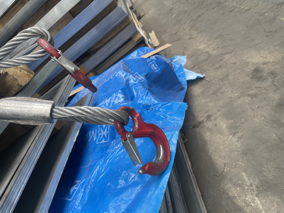 The image displays an industrial scene within a storage or staging area belonging to Metal Invest LTD in Sofia, Bulgaria, identified by the distinctive white logo on the blue tarpaulin. Two heavy-duty steel wire rope slings are prominent. The primary sling in the foreground consists of braided, silver-grey wire rope secured with a metal thimble or swage, leading to a large, red industrial lifting hook. This hook features a silver-colored, spring-loaded safety latch, which is in the closed position. A second, similar red hook and wire rope sling are partially visible in the upper right portion of the frame. These lifting components are positioned above a substantial stack of flat, rectangular metal sheets, likely galvanized steel, which are partially obscured by a crumpled blue plastic tarpaulin. Multiple instances of a white, stylized 'M' or 'MW' logo are visible on the tarpaulin. Behind and adjacent to the stacked metal sheets, elements of wooden pallets or crates are visible. The ground surface is a dark grey, worn concrete floor, indicating an industrial environment. No individuals are present, and no active operations are depicted.
