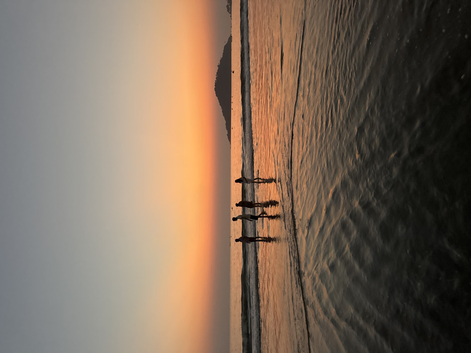 A beach sunset image shows a dramatic sky with orange and gray hues. Three people are silhouetted in the shallow water, creating reflections on the wet sand. The ocean's surface is slightly textured with gentle waves. A distant hill or mountain adds a small land element to the composition. The light is soft, casting a warm glow on the water and highlighting the silhouettes.