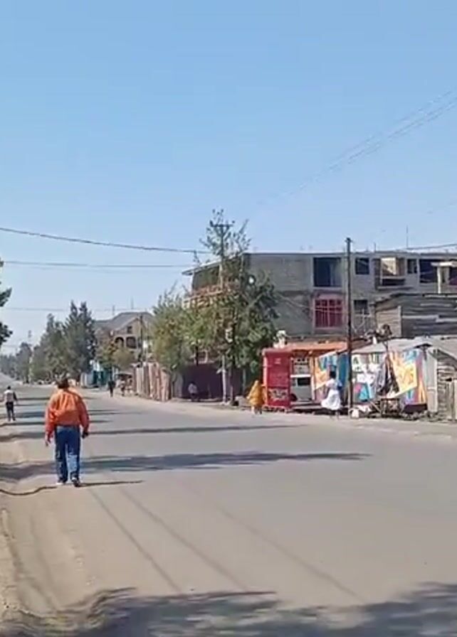 n empty road in a town on a sunny day. Several people are walking along the sidewalk, and there are small shops lining the street. In the distance, a building is under construction. Overhead, power lines cross the street. The sky is clear blue.