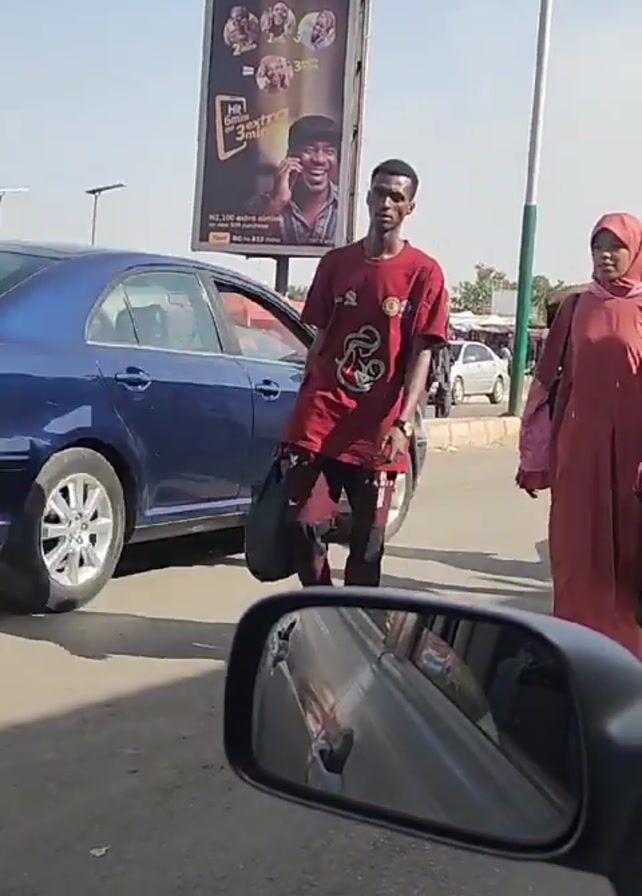 bustling street scene in what appears to be an African city during daylight. Pedestrians are crossing the street, and vehicles are moving. A large billboard advertising MTN Beta-Gist is prominently displayed. People are dressed in various styles of clothing, including traditional attire and casual wear. A red tent is set up on the side of the street, possibly for vendors or a market. The video is taken from inside a car, with the side mirror visible in the foreground, reflecting the surroundings. The weather appears sunny and clear.
