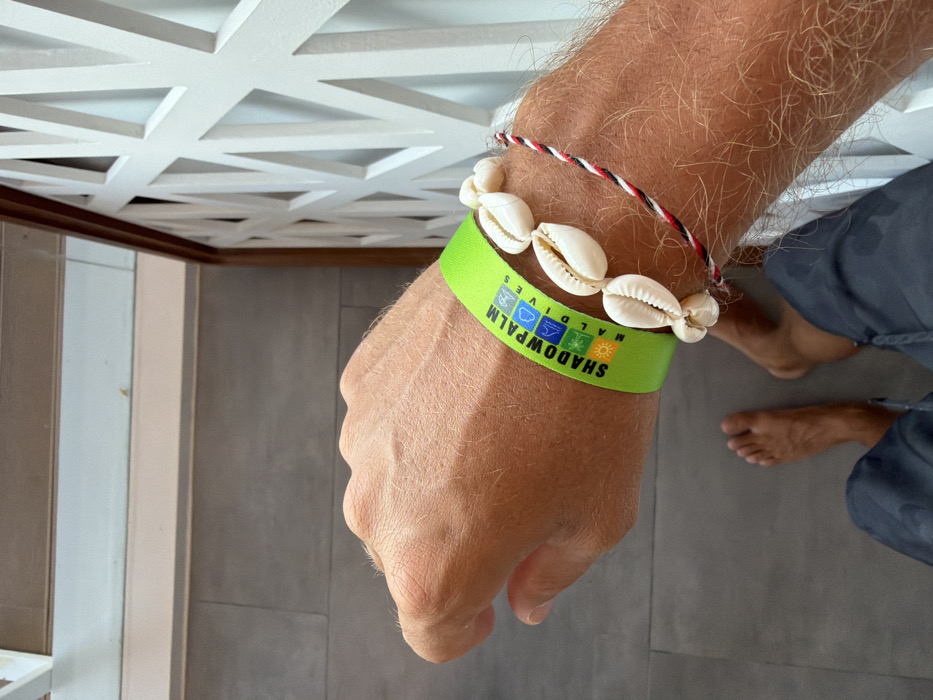 The image displays the left arm and hand of an individual, likely male, positioned indoors or in a semi-enclosed space. The forearm is covered in light-colored hair. A prominent neon green wristband encircles the wrist, bearing the text "SHADOWPALM MALDIVES" vertically, accompanied by four small icons: a sun, a wave, a palm tree, and a diving mask. Below this, two additional bracelets are worn: one composed of multiple white cowrie shells strung together, and another a thin braided cord featuring red, white, and black stripes. The hand is slightly clenched. In the background, the individual's bare feet and lower legs, partially clad in dark gray shorts, are visible on a dark gray tiled floor. To the right, a white wooden partition with a repeating geometric triangular pattern rises vertically, topped by a brown wooden rail. The lighting suggests an indoor or shaded environment. The "SHADOWPALM MALDIVES" wristband indicates the scene is located at or associated with the Shadow Palm Guesthouse in Maafushi, Maldives.