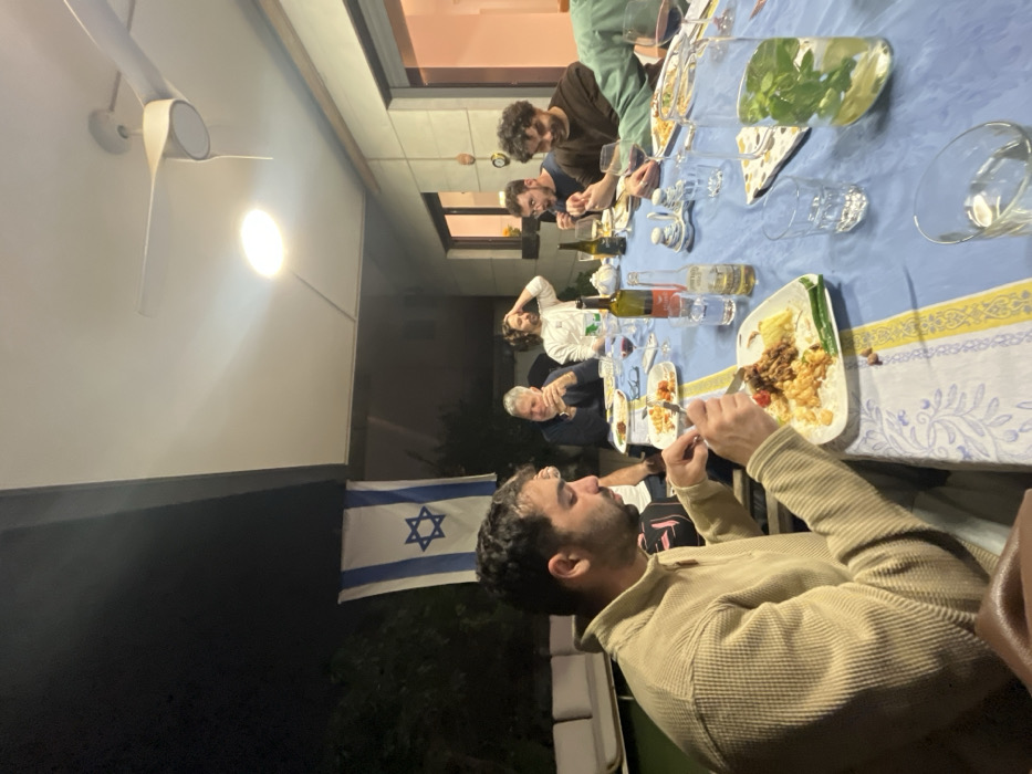 A group of people are sitting around a long table, eating dinner. The table is covered with a blue tablecloth and set with plates, glasses, and bottles. Some people are eating and talking. An Israeli flag hangs in the background. The scene appears to be outdoors in the evening, with a light fixture on the ceiling.