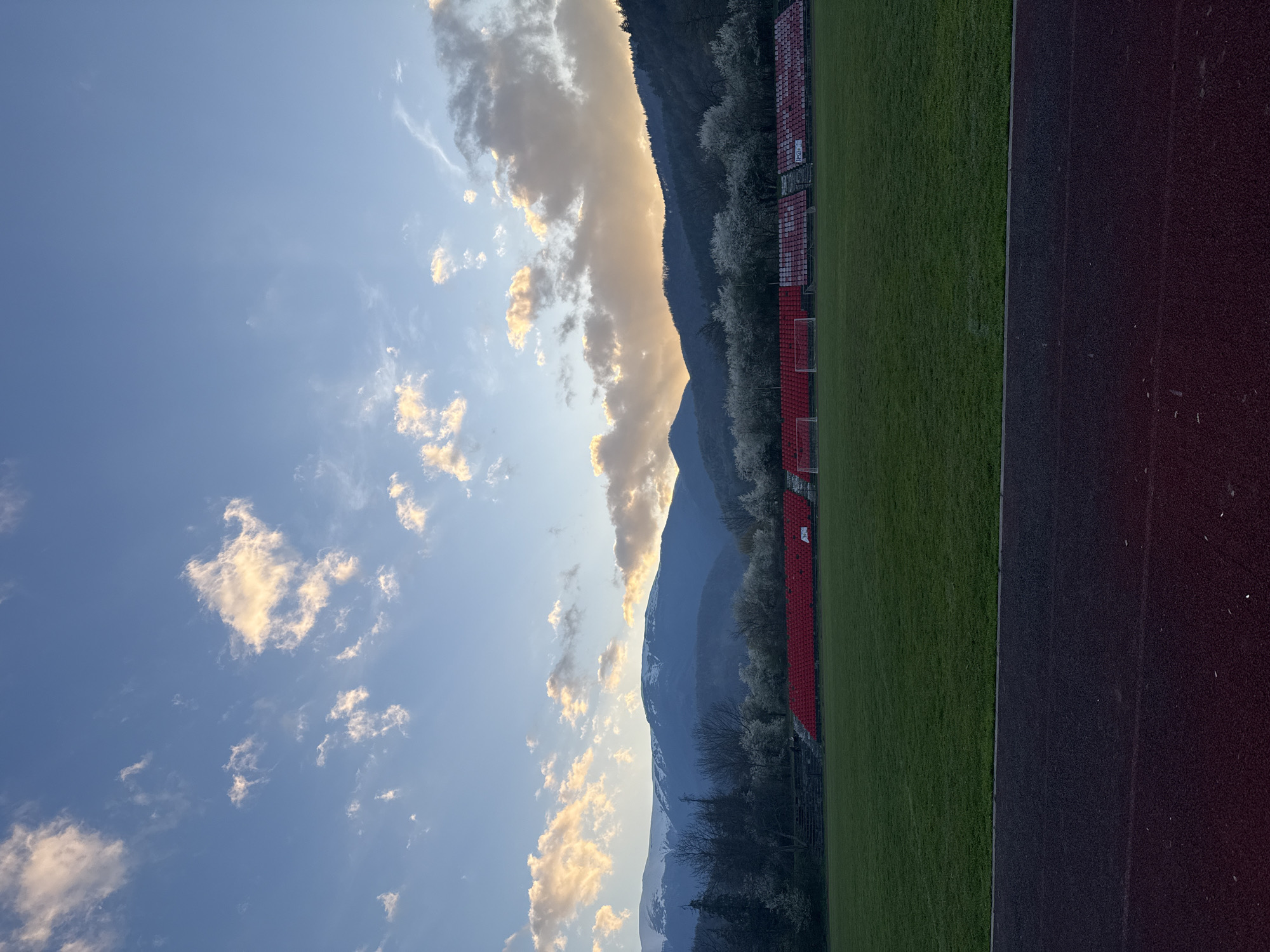 The image depicts an outdoor scene in Berkovitsa, Bulgaria, at golden hour. Dominating the left of the frame is a blue sky dotted with clouds tinged with orange from the setting sun. Adjacent to the sky is a mountain range that runs vertically, with snow-capped peaks visible. To the right of the mountains lies a stadium. The stadium has red seating, a green grassy field, and a reddish-brown running track. The field appears to be well-maintained. There are no people in the image. The focus is on the landscape and stadium infrastructure.