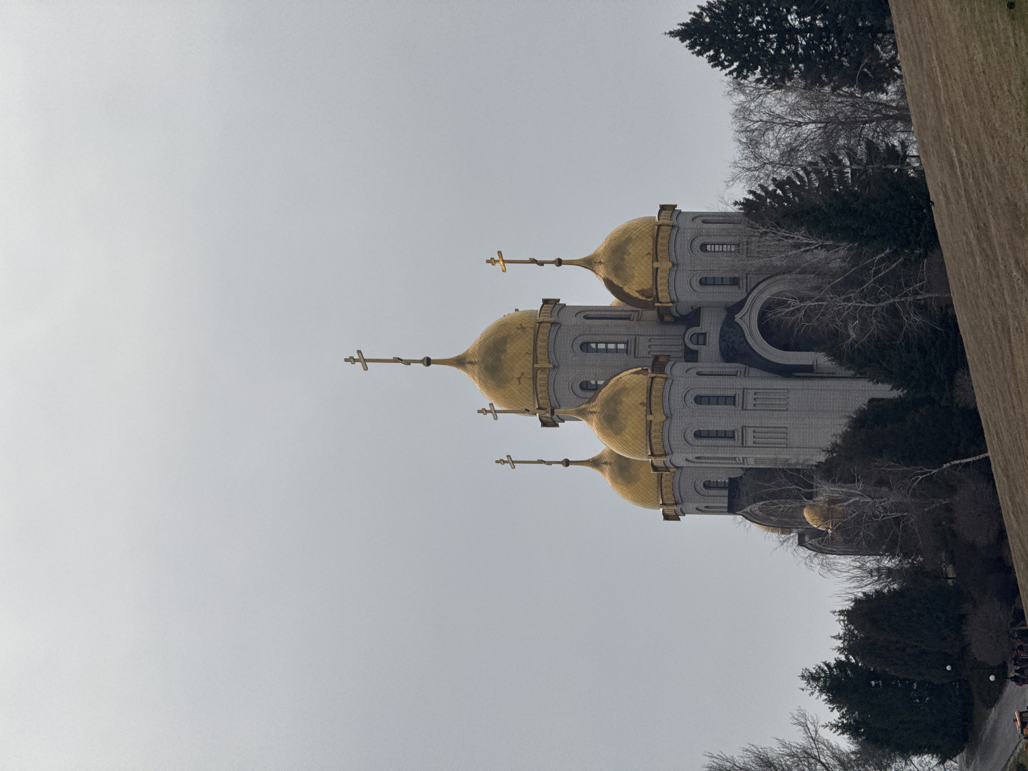The image displays the All Saints Church at Mamayev Kurgan in Volgograd, Russia, under an overcast sky. The church is a large structure built of light grey brick, featuring at least five golden onion domes, four of which are topped with golden Orthodox crosses. The central dome is the largest, flanked by four smaller domes. The building facade incorporates tall, narrow arched windows and decorative elements around the domes. The church is positioned on an elevated, brown-tan grassy slope that occupies the lower-right foreground. Surrounding the church's base are dense clusters of trees, including dark green coniferous trees and leafless deciduous trees with light-colored bark, suggesting a cold season. In the lower-left quadrant, a dark asphalt path curves upwards, partially obscured by trees. Two white spherical lamp posts are visible along this path. A small orange utility vehicle is partially visible on the path, near a small group of approximately five to seven indistinct individuals who appear to be walking or standing. The scene is illuminated by diffuse, soft light consistent with an overcast day.