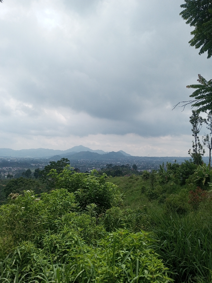 This image presents an elevated, panoramic view overlooking the city of Vieng Phouka, Laos, under a heavily overcast sky. The upper portion of the frame is filled with dense, uniform grey clouds, indicating diffused light without direct sunlight. Below the clouds, a sprawling urban landscape occupies the mid-ground, characterized by a concentration of buildings, predominantly low-rise structures with diverse rooftops, interspersed with numerous trees. This urban expanse extends towards a distant horizon line formed by multiple layers of hazy, blue-grey mountains. The foreground is dominated by a lush, dense covering of vibrant green vegetation, including tall grasses, various leafy shrubs, and smaller plants, suggesting an uncultivated hillside or natural area. A tree branch with pinnate leaves partially intrudes into the upper right corner, while other sparse trees rise from the mid-right. No human figures or animals are visible within the scene, and no specific actions are depicted.