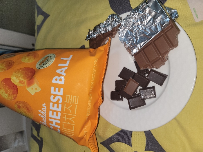 The scene is an indoor setting in Incheon, South Korea. A partially opened orange bag of "Cheddar CHEESE BALL" snack, displaying images of cheese balls and a cheese slice, stands upright on a yellow surface with a repeating grey pattern. Korean text "체다치즈볼" is visible on the bag. To the right, a white round plate holds a partially unwrapped chocolate bar. The chocolate bar is broken, with multiple squares detached and scattered across the plate, exhibiting varying shades of brown. Crinkled aluminum foil from the chocolate bar's packaging is also present on the plate. No individuals are visible.