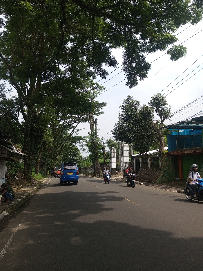 The scene depicts a street view in the city of Sandamal Eliya, Sri Lanka, under bright, hazy daylight. An asphalt road, approximately two lanes wide, with a faded yellow dashed center line, extends into the distance, partially shaded by overhead trees. On the far left, a person wearing a patterned shirt and dark trousers is squatting on a dirt strip beside a concrete curb. Behind them, a basic structure with a corrugated roof is partially visible. The left side of the road is lined with a dense row of tall, mature trees forming a thick canopy. Vehicular traffic occupies the road. A blue minivan is observed driving away from the viewer in the left lane. Approaching the viewer in the right lane are three motorcycles. The leading motorcycle is light blue, operated by an individual wearing a white helmet and light-colored top. Behind it, a dark motorcycle carries a rider in a dark helmet and clothing, with a passenger wearing a red top. Further back, a third light-colored motorcycle is ridden by an individual in a light helmet. More vehicles, primarily motorcycles, are visible further down the road in the distance. The right side of the road features a sloped embankment with a terraced wall displaying green, orange, and blue sections. Beyond this wall, a building with a blue upper section and orange-accented lower facade is visible. Further back along the right, a white structure with visible columns, possibly a gateway, stands. Overhead, numerous power lines crisscross against the bright sky. Distinct shadows from the trees are cast across the road surface.