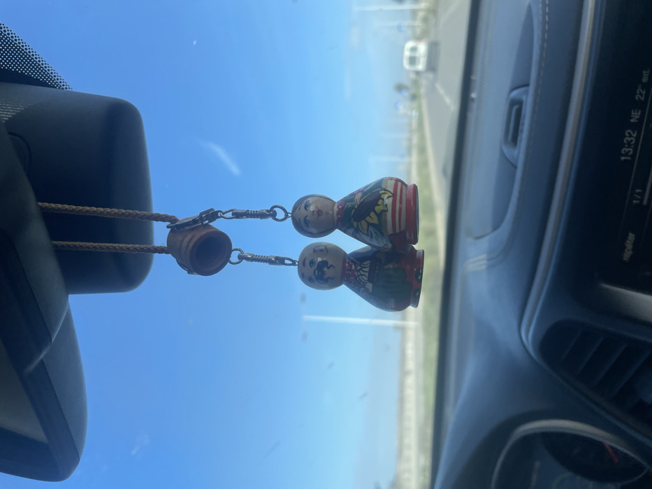 The image displays a view from inside a vehicle, oriented toward the front, with the location identified as Ain Harrouda, Morocco. In the foreground, a dark gray rearview mirror housing is visible at the top center. Suspended from this housing by a light brown braided cord is a small, light brown, bell-shaped ornament. Attached below this ornament via metal rings are two small, painted wooden figures. The left figure portrays a male with a dark mustache, white face, and a patterned green, red, and black outfit. The right figure depicts a female with light skin, dark hair, red lips, and a garment featuring a yellow sunflower on a red and white striped base. The vehicle's dark dashboard occupies the lower portion of the frame, showing central air vents, a speaker grille, and a digital display indicating "13:32 NE 22°ext." Beyond the windshield, a multi-lane asphalt road extends into the distance under a clear, bright blue sky. A concrete median or barrier separates the road lanes. A white van is visible in the far distance, traveling away from the camera. Utility poles are present along the roadside.