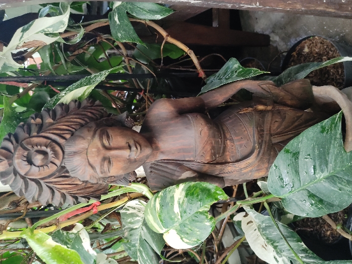 A vertical, dark brown wooden carving of a slender female figure stands centrally, partially enveloped by lush variegated foliage