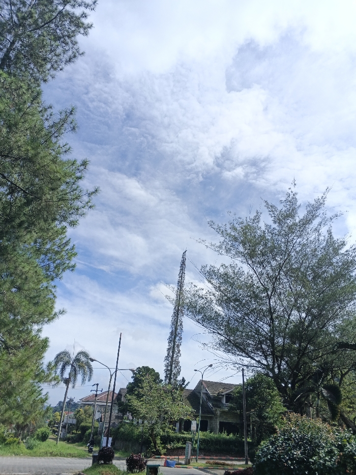 The image depicts an outdoor daytime scene in ឃុំ ផាត់សណ្ដាយ, Cambodia, characterized by a mix of natural vegetation and residential structures under a bright, partly cloudy sky. The upper two-thirds of the frame are dominated by a pale blue sky featuring scattered white and light gray stratocumulus and cirrus clouds. In the foreground, dense green foliage frames the scene: a substantial coniferous tree occupies the left margin, and another large tree with full green canopy is on the right. A very tall, slender, dark green coniferous tree stands prominently in the midground, extending nearly to the top of the frame. To its left, a palm tree with characteristic fronds is visible. Numerous other smaller trees and green shrubs are dispersed across the midground and foreground. Several structures are visible in the midground. A two-story building, appearing to be residential, is located to the right of center. It features a complex, dark-tiled gabled roof and dark, recessed window openings, suggesting it may be vacant or disused. Portions of other buildings with reddish-brown tiled roofs are partially visible through the trees on the left side of the midground. Infrastructure elements include multiple black utility poles with overhead wires running horizontally across the midground. One streetlight fixture is clearly discernible. A paved asphalt roadway or path is visible in the lower-left quadrant, curving gently into the distance, bordered by grass and low-lying plants. No individuals or animals are present in the scene.