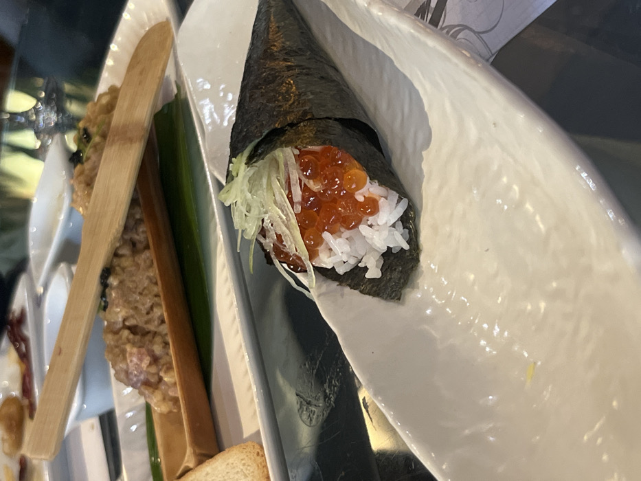 An indoor restaurant setting in Mexico City, Mexico, is captured from a close-up, slightly elevated perspective. In the foreground, a single temaki sushi hand-roll rests on a white, elongated ceramic dish. The temaki is wrapped in dark green nori and filled with white sushi rice, topped with a generous portion of bright orange ikura (salmon roe) and garnished with thin, light green julienned scallions. In the midground, situated behind the temaki dish, a rectangular white ceramic dish presents another food item: a light brown, granular substance, possibly a tartare, served in a natural bamboo boat-shaped container. A slender, light brown wooden paddle or spoon lies diagonally across this dish. A dark green leaf is placed beneath the bamboo container, and a toasted bread slice or cracker is partially visible to the left. The table surface beneath the dishes is dark and reflective. The background is blurred, showing indistinct elements of a dining environment. No people are visible.