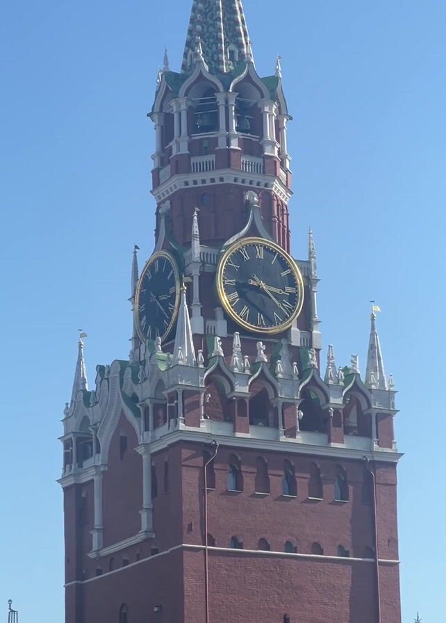 - "low angle view of the Spasskaya Tower, a prominent tower with a clock on Red Square in Moscow, Russia, against a bright blue sky" by FM-qrPQ92, licensed under CC BY 4.0