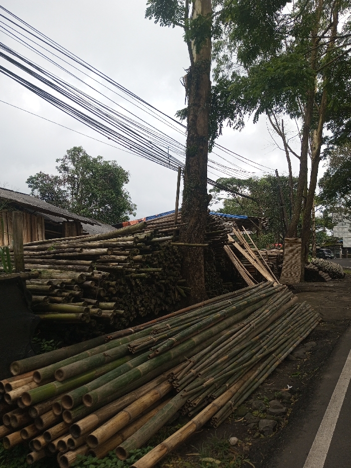 A large collection of bamboo poles dominates the scene. Some are stacked high near a tree and building, while others are laid out along the roadside. The poles vary in color from green to yellowish-brown. Overhead, numerous power lines stretch across the sky. Trees and foliage fill the background, and a building is visible to the left. The sky is overcast.