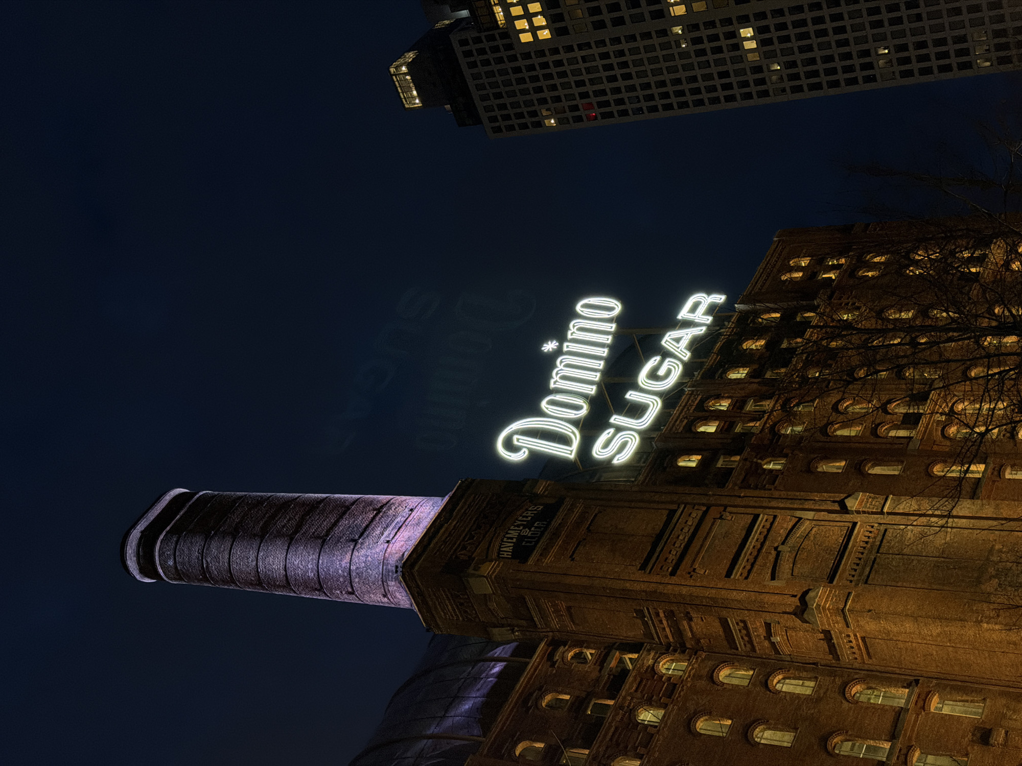 The image depicts the Domino Sugar Refinery building in Brooklyn, New York at night
