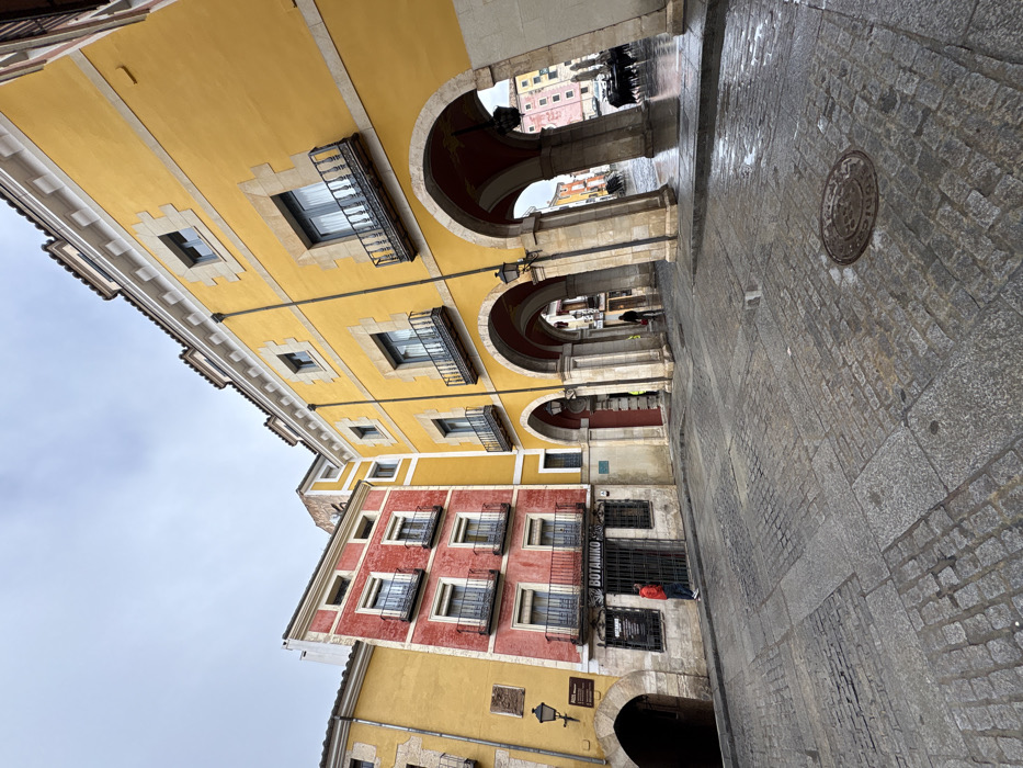 The image captures a street scene in Plaza Mayor, Cuenca, Spain, under an overcast sky, with the cobblestone street visibly wet, indicating recent precipitation. The foreground features a dark grey cobblestone pavement, incorporating larger stone sections and a circular manhole cover. Dominating the right side of the frame is a multi-story building, likely the Casa Consistorial, painted bright yellow with white decorative cornices and window surrounds. Its ground floor consists of multiple prominent arches, revealing a covered walkway. Upper floors feature rectangular windows, each equipped with a black wrought-iron balcony. One streetlamp is visible under an archway. To the left of the yellow building stands a three-story red building, also featuring black wrought-iron balconies on its windows. The ground floor displays a sign that reads "BOTANIKO" above a closed metal gridded entrance, with another sign "BASKER" below it. A figure wearing a red jacket is positioned on the sidewalk in front of this red building, appearing to look towards the entrance. Further to the left, a section of another yellow building is visible with an arched entryway. A blue plaque is affixed to the wall between the red and the main yellow buildings. Through the arches of the main yellow building, the street continues, revealing further historic architecture, including a building with a pink facade in the distance. A second individual is partially visible walking under the arches in the mid-ground. Distant dark forms, possibly vehicles or structures, are faintly discernible through the furthest archway on the right.