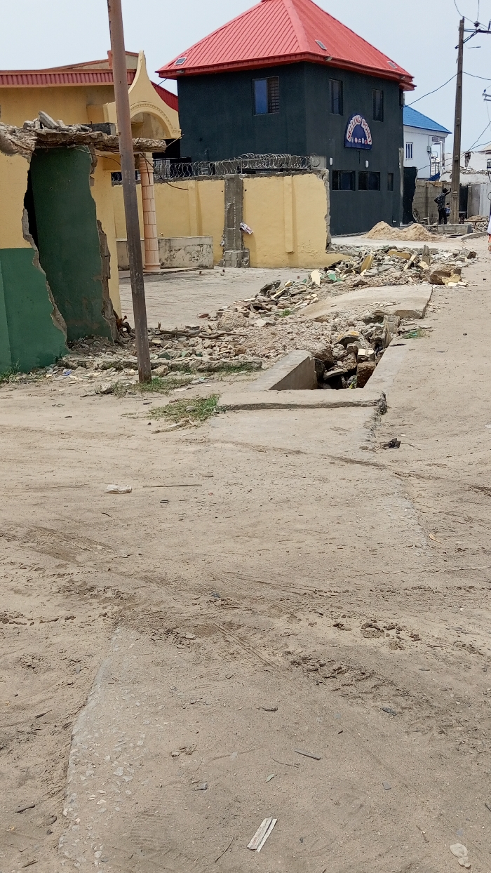 dirt road in Lekki, Nigeria (latitude: 6.473, longitude: 3.733) with a concrete drainage ditch running along the edge. The road is covered in debris and dirt, with tire tracks visible. A partially demolished building with a red roof stands to the left of the road. The building has a green wall and a sign on the side that says "Charming Hotel". There is also a small building with a white roof and a blue awning located behind the partially demolished building. The road leads to another building, which is out of focus. There are no people visible in the image.