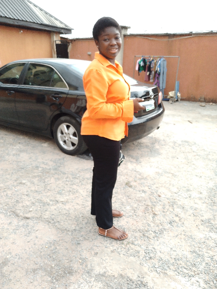 A young adult female stands in an unpaved outdoor area in Orie Uratta, Nigeria. She is positioned slightly right of center, facing forward and smiling towards the camera. She wears an orange long-sleeved collared shirt, black trousers, and brown flat sandals. Her left hand holds a small white rectangular object near her waist. Behind her, a black sedan, identified by its Toyota emblem on the trunk, is parked, displaying a white license plate or holder with a green element. Further in the background to the right, a metal clothing rack holds various garments. The ground is a mixture of dirt and gravel. A reddish-brown wall extends across the right background, while a building with a grey corrugated roof is partially visible in the upper left behind the vehicle.